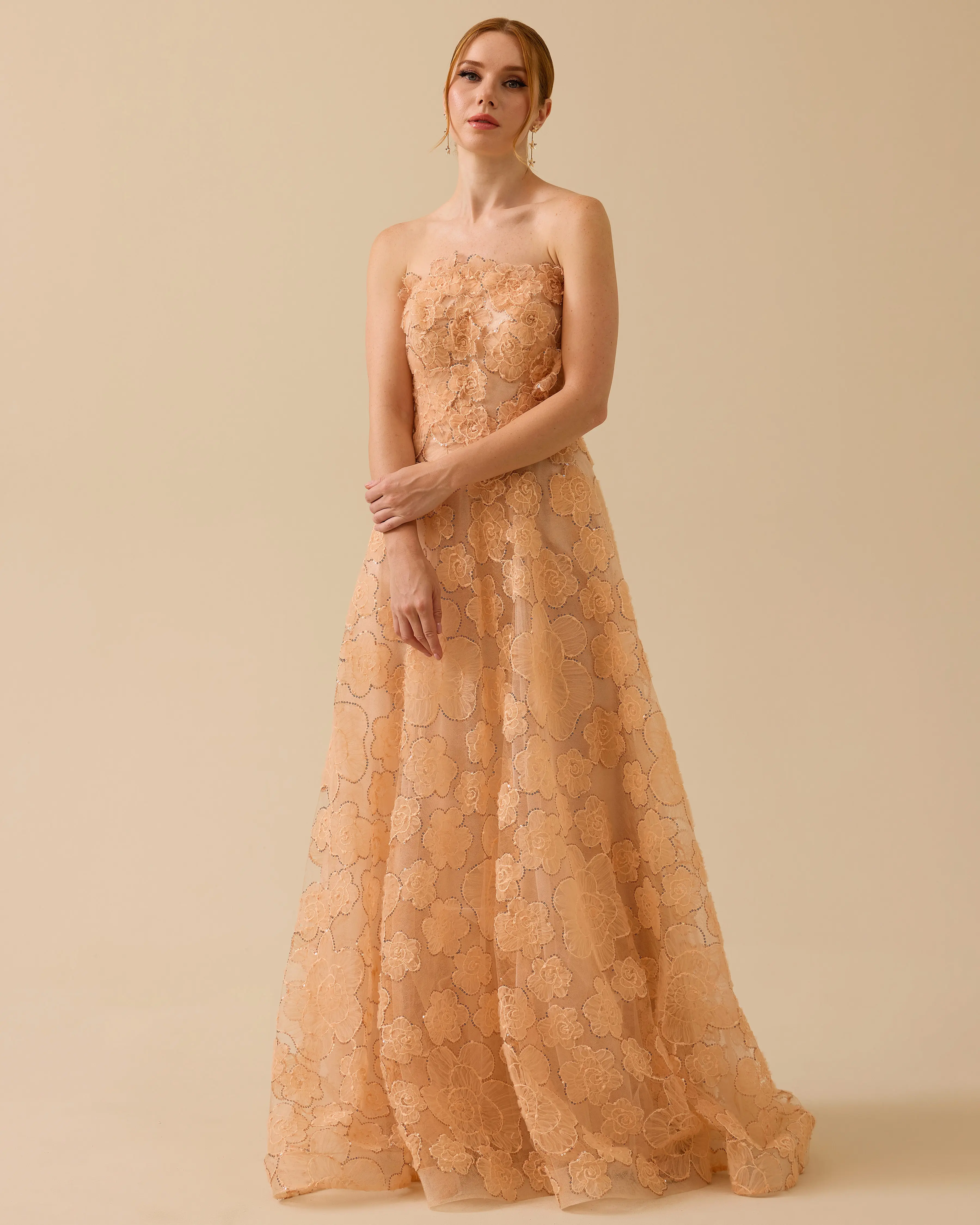 Straplez Yaka Çiçek Motifli Tül Abiye